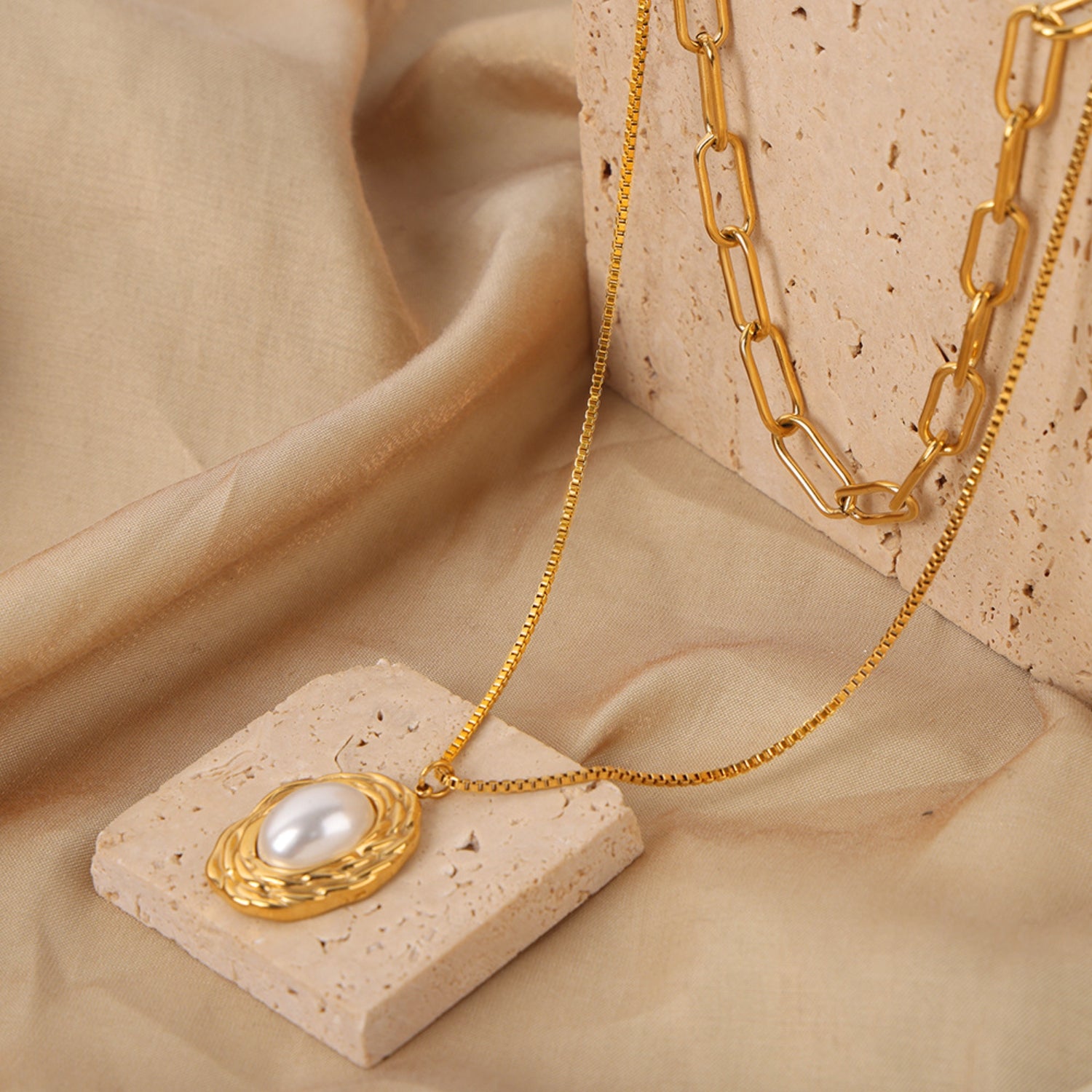 - Material: Synthetic pearl, 18K gold-plated, Titanium steel
